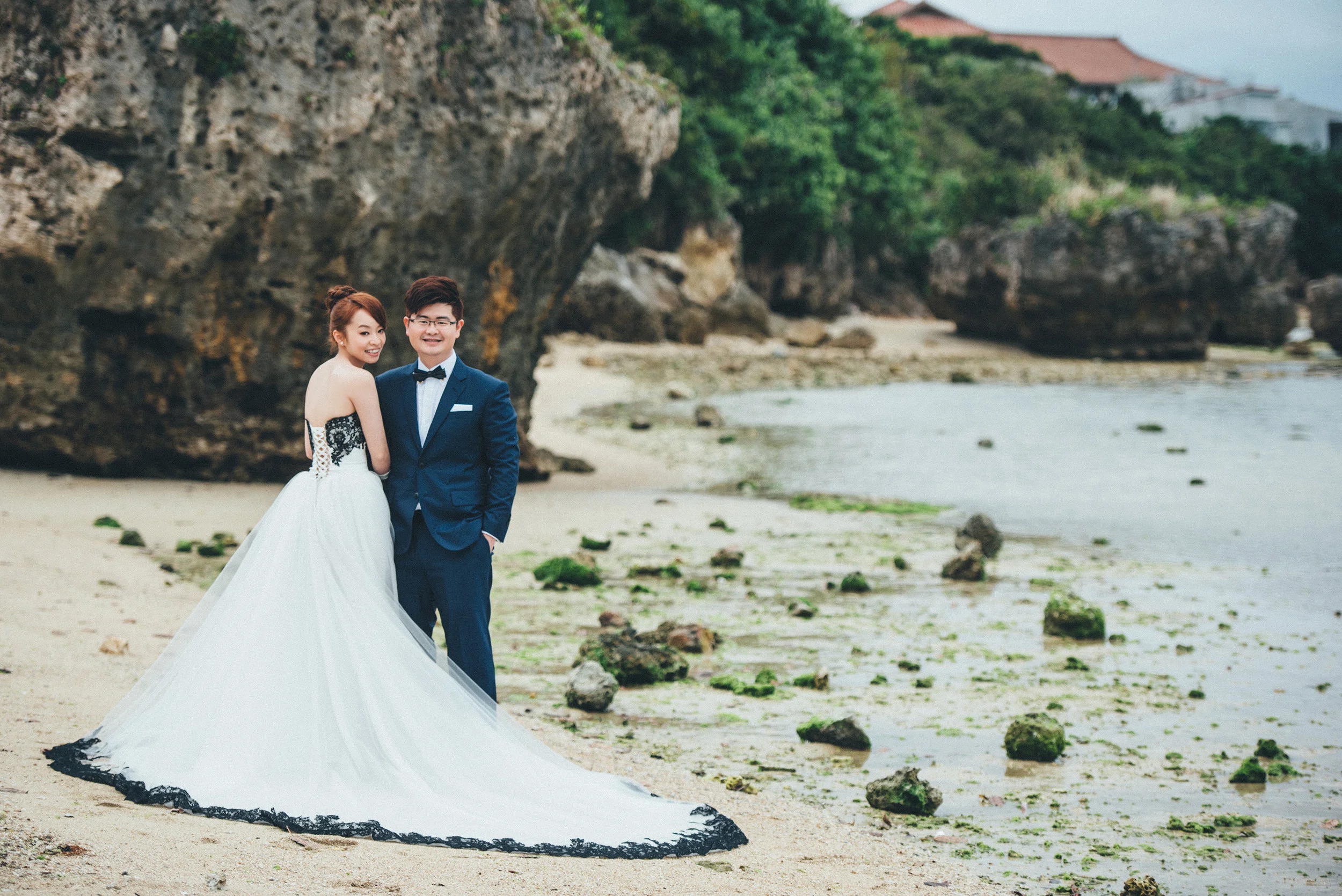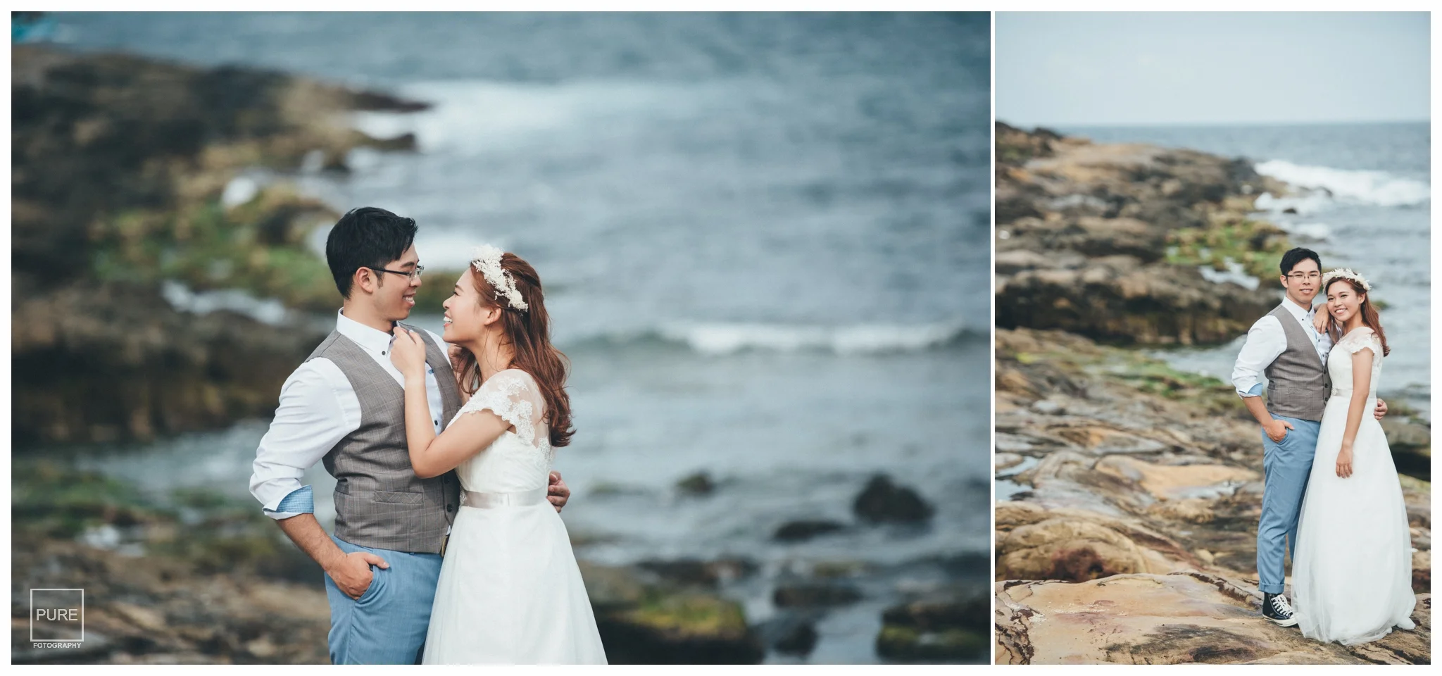 有別於沙灘的柔和感,望幽谷的沿岸更有種壯麗感,格外襯出新娘白紗的柔和。