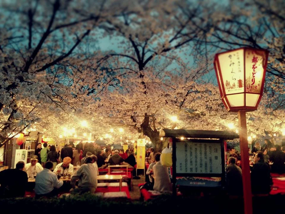 櫻花雨下鋪上草蓆,好友們聚成一圈著拿起啤酒舉杯歡慶。
