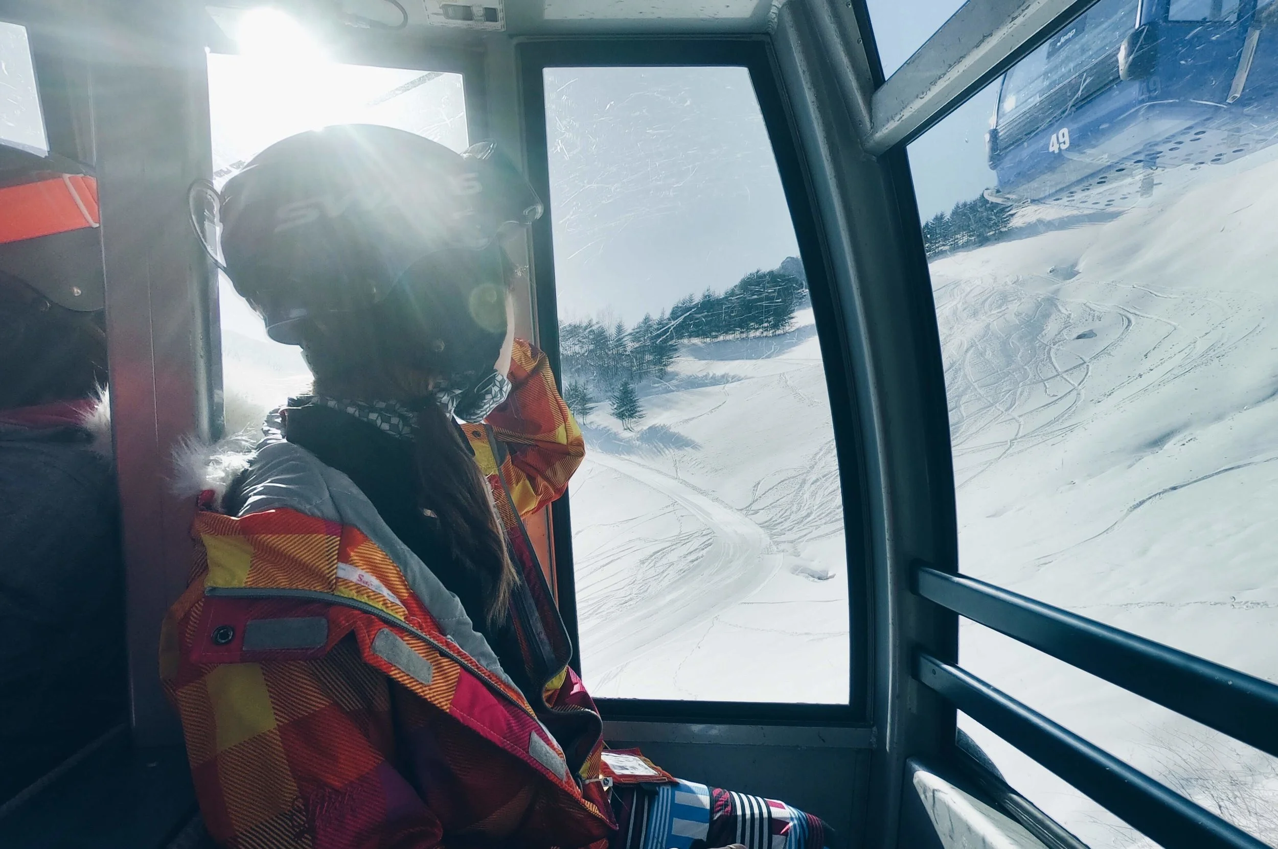 而在苗場裡,我們這次坐上的是廂型纜車後,再坐上滑雪的纜車,