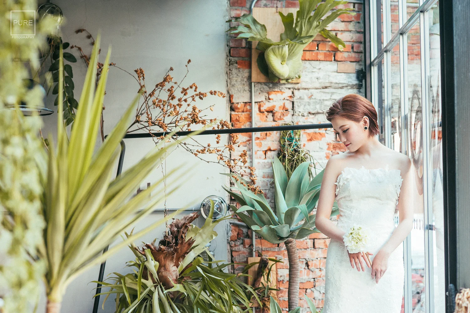怡瑩跟恆賢兩人的最愛是拉拉熊, 但他們兩人可不是像拉拉熊的名言過生活, 「可以的話,真想這樣懶~懶過日子(できるなら,ず~っとダラダラしていたい)」 反而是很認真的準備著我們的拍攝過程, 怡瑩喜歡甜美又帶著一些經典風味,所以場景的設定, 從一開始想到拉拉熊的咖啡廳, 到後來去到North of North家具店拍攝。 造型上,怡瑩一開始很擔心短髮的效果不佳, 但是經過造型師的妙手生花(?), 短髮不只是能展現俏麗活潑,也能有俐落帥氣的一面呈現。 也因為怡瑩忠於「真」,所以他都是用自己原本頭髮的長度來做變化。 也一起提供給想做短髮新娘參考囉~